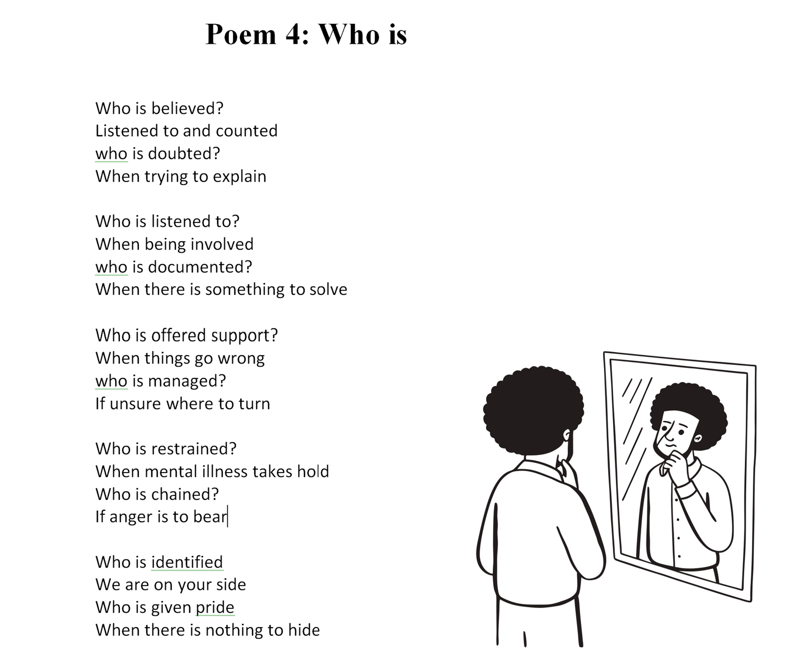 I started with a couple of my own poems, drawn from my work around carers, stigma, and racial inequality in mental health.