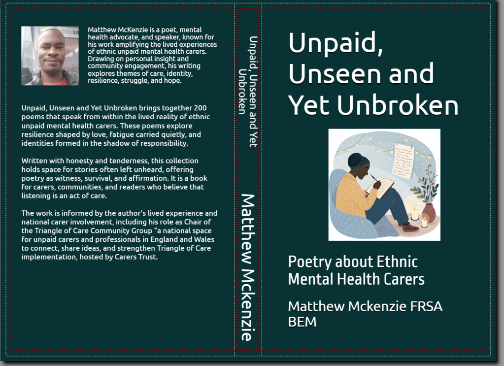 Matthew McKenzie FRSA BEM, poet and advocate for unpaid ethnic mental health carers, is inviting carers involved in NHS Trusts, PCREF (Patient and Carer Race Equality Framework), and Trust involvement registers to submit their poems for an upcoming 2026 poetry collection. This collection will spotlight minority carers’ voices and explore themes of race, culture, and lived experience in mental health care.
